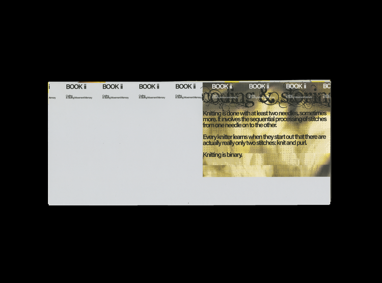 Taking notice of the mechanization and commerciality in the production of knitwear, this book is a metamorphosis from handmade binary to total reproduction. The book reads from bottom paragraph to top paragraph, imitating the motion of how knitting patterncard would be read by a vintage sock-making machine.